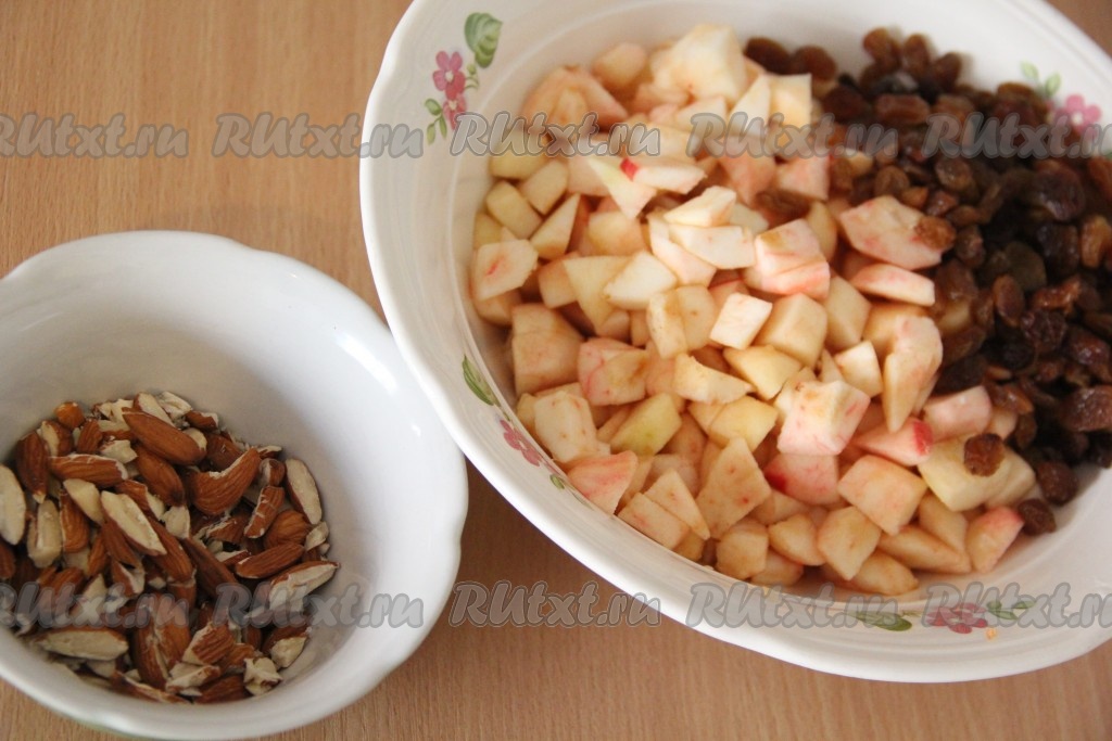 Пока тесто отдыхает, займёмся начинкой. Яблоки вымыть, очистить от кожуры и семян, нарезать на маленькие кубики. Изюм обдать кипятком, а затем откинуть на дуршлаг, чтобы стекла лишняя жидкость. Орехи крупно порубить ножом.