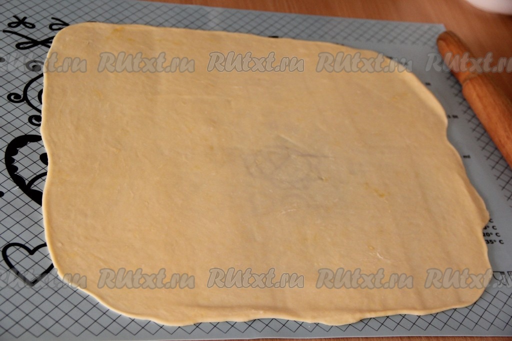 Тесто освободить от пищевой плёнки и на столе, припыленном мукой, или на силиконовом коврике раскатать с помощью скалки в прямоугольный пласт. Раскатывать тесто лучше до полупрозрачного состояния, таким образом наш штрудель будет более нежным и слоистым.
