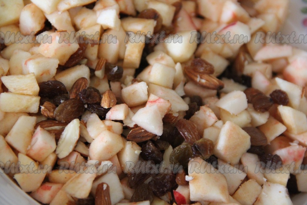 Соединить яблоки, изюм и орехи. Всё хорошо перемешать. По желанию можно сбрызнуть яблоки лимонным соком. Можно в начинку добавить коньяк или бренди, но это по желанию.