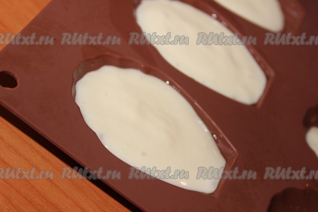 Неглубокие силиконовые формочки (я взяла силиконовую форму для выпечки печенья "Мадлен") немного смазать растительным маслом. Разложить тесто по формочкам, заполняя их на 2/3 объёма. Можно приготовить это печенье и в формочках для кексов, маффинов, только выкладывать в такие формочки нужно по 2 чайных ложки теста.