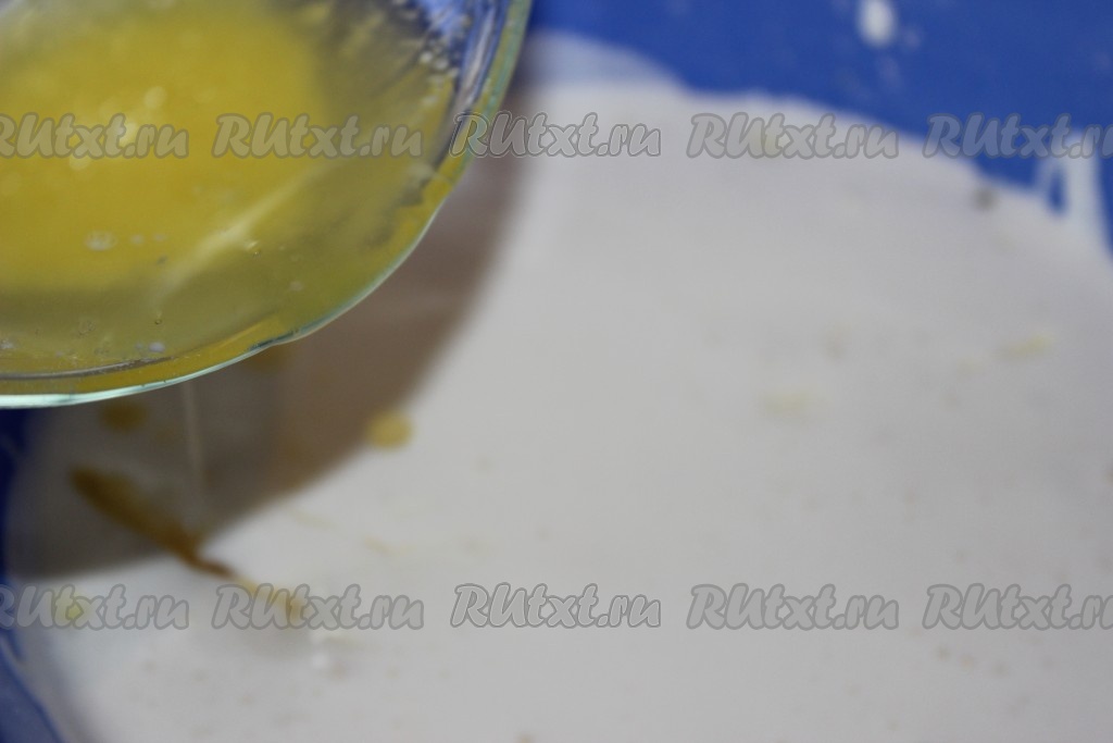 Добавить растопленное и охлаждённое до комнатной температуры сливочное масло, тщательно перемешать яично-масляную смесь ложкой.