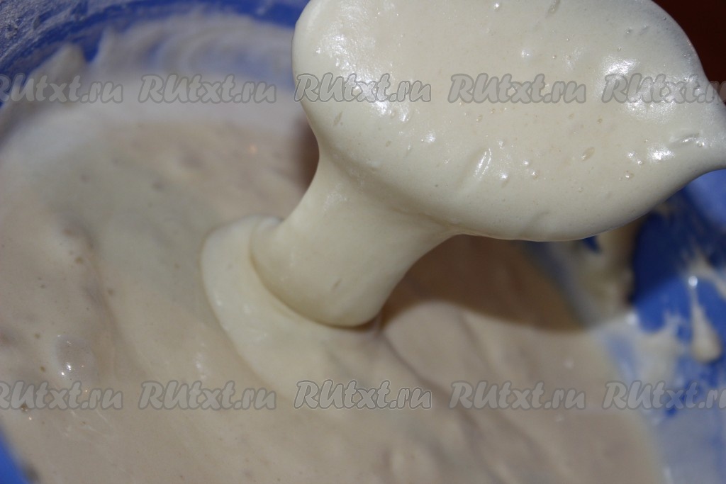 Через сито просеять муку с разрыхлителем, добавить в яично-масляную смесь. Аккуратно перемешать ложкой до однородной консистенции. Тесто должно получиться воздушным, напоминающим густую сметану.