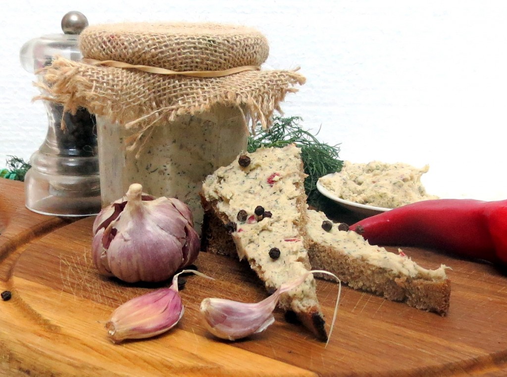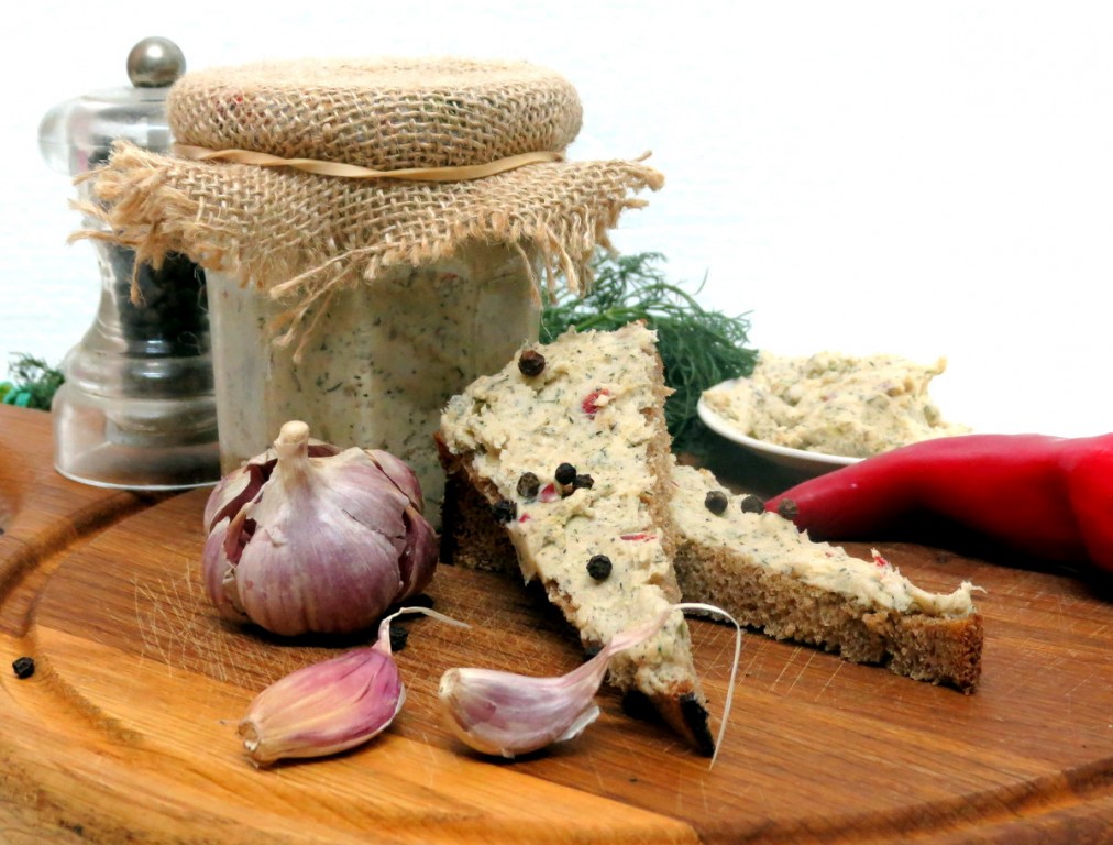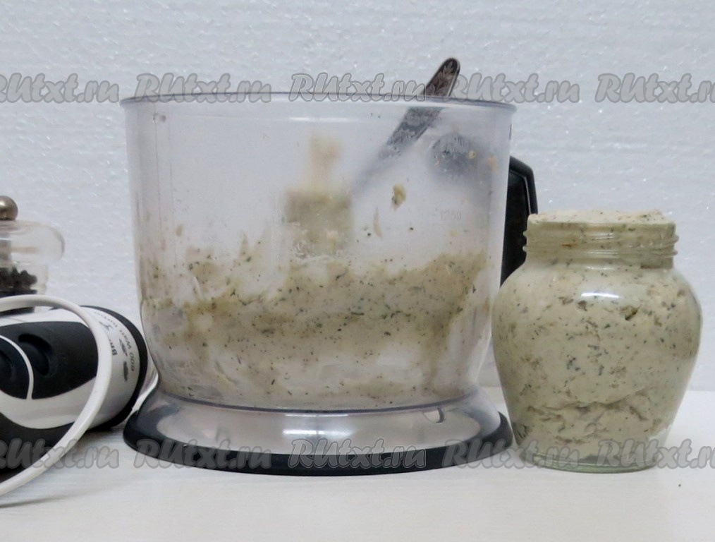 Складываем в чашу комбайна оставшуюся половину нарезанного сала, несколько зубчиков чеснока, острый перец, чёрный перец, молотый через мельницу, несколько веточек мелко нарезанного укропа, соль. Перемалываем все компоненты в блендере до однообразного состояния. Второй вариант намазки из сала готов.
