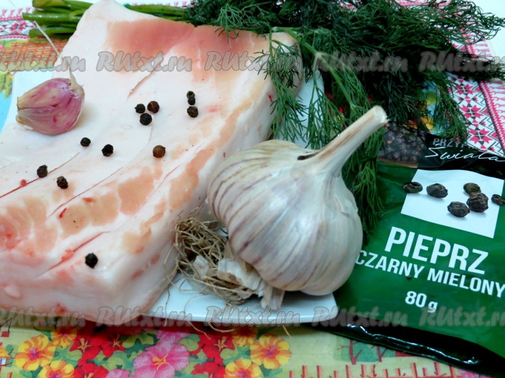 Для приготовления намазки нам понадобится: сало, чеснок, перец чёрный горошком, перец жгучий, укроп, соль.