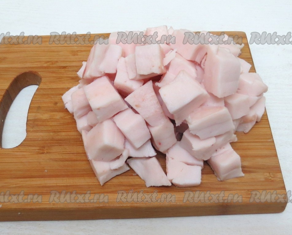 Сало нарезаем на кусочки. У нас они великоваты. Желательно на меньшие, чем на фото.