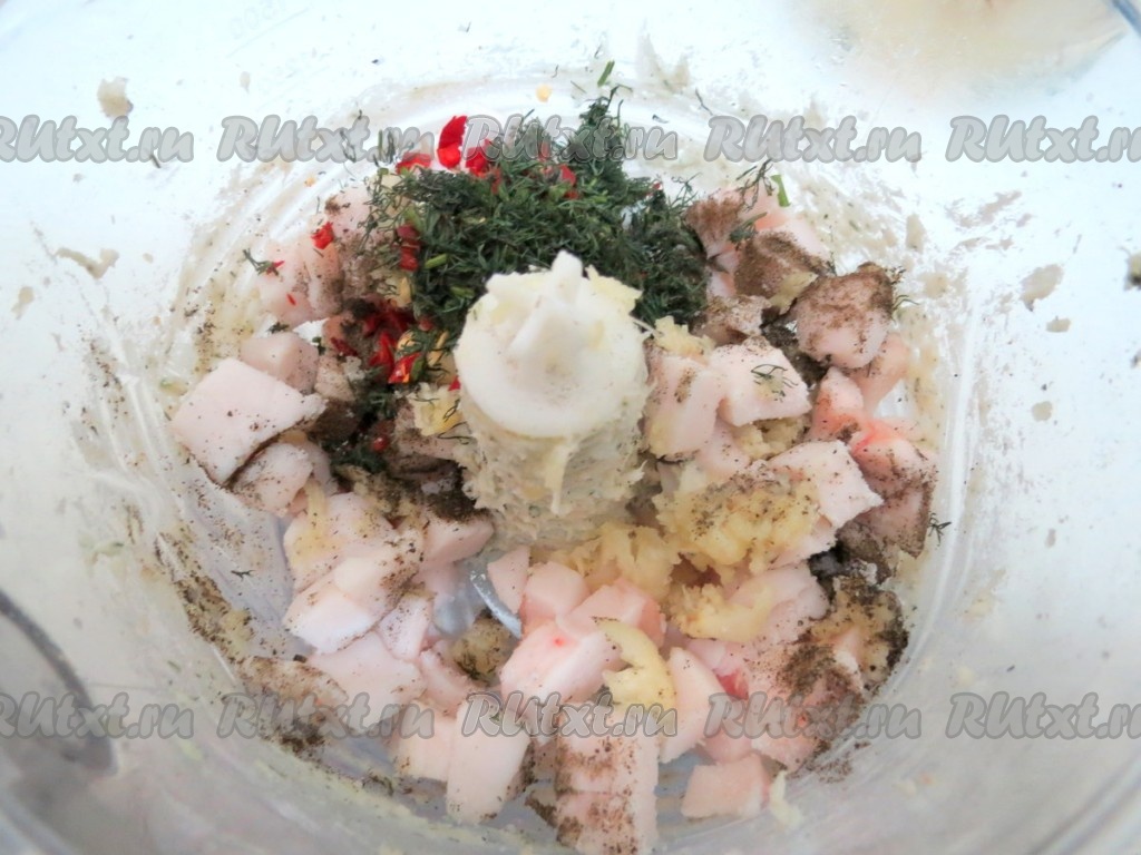 Половину сала вкладываем в комбайн. Туда же отправляем несколько зубчиков чеснока, выдавленных через пресс, перец горошком, предварительно перемолотый в мельнице. Свежий перемолотый перец добавляет невероятный аромат (если нет мельницы, добавьте чёрный молотый перец). Отправляем в чашу комбайна несколько веточек мелко нарезанного укропа. Повторяю, сало нарезать нужно на маленькие кусочки, тогда они быстрее и легче перемалываются.