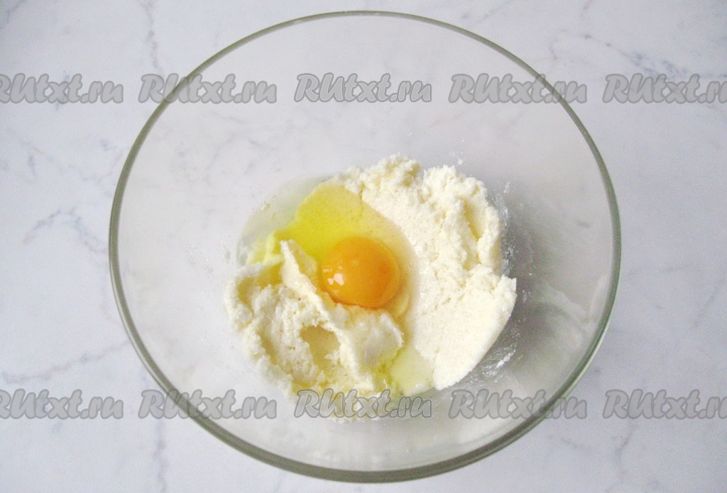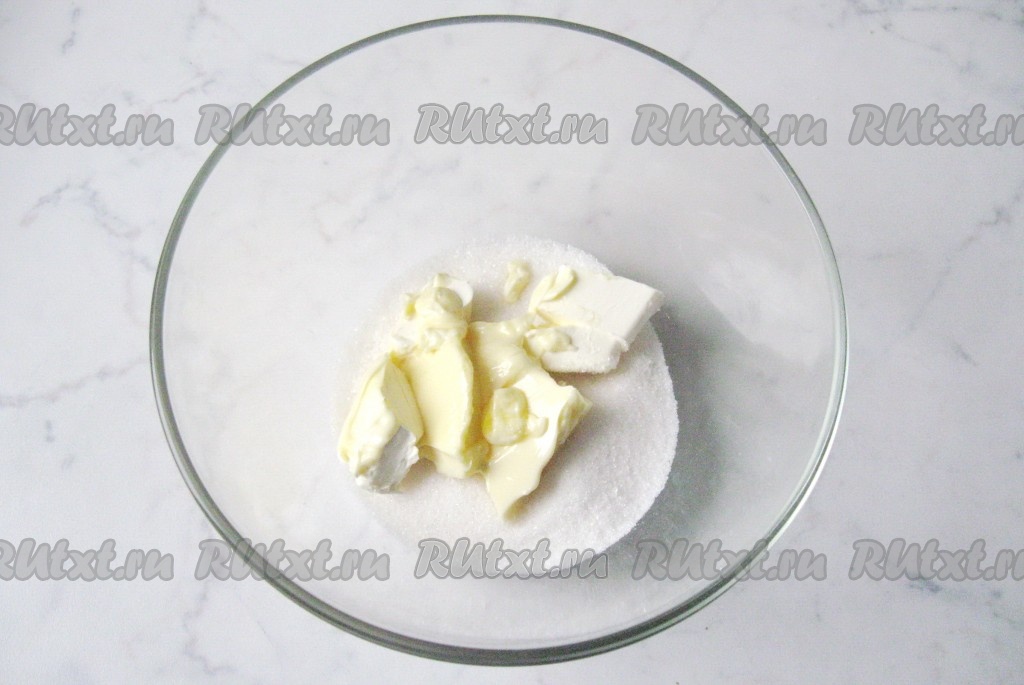 Сливочное масло для замешивания теста должно быть мягким, поэтому его нужно будет заранее достать из холодильника. Мягкое сливочное масло соединить с сахаром в глубокой миске.