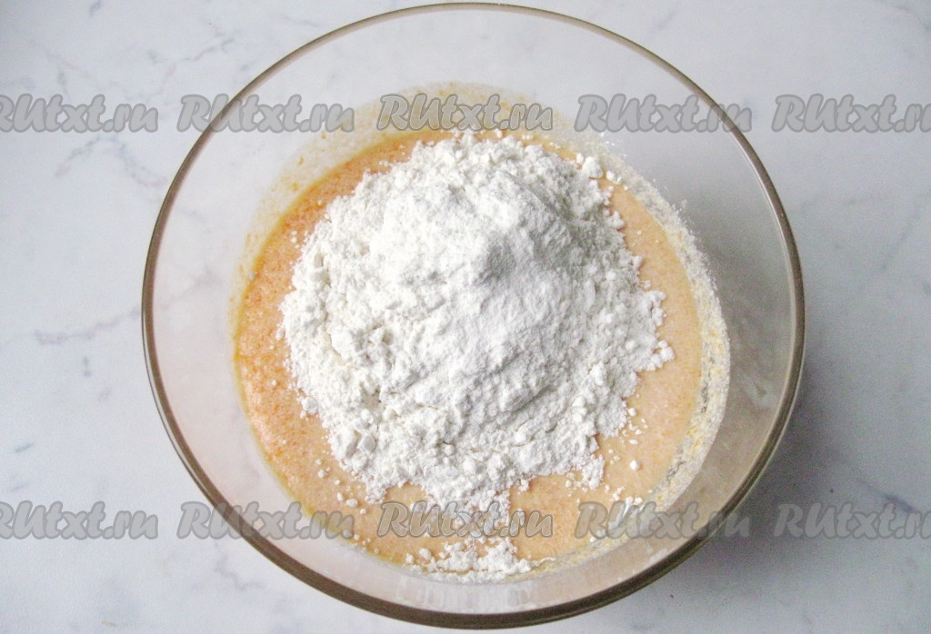 Всыпать в миску соду, погашенную уксусом, и 150 грамм муки, перемешать тыквенное тесто лопаткой до однородности.