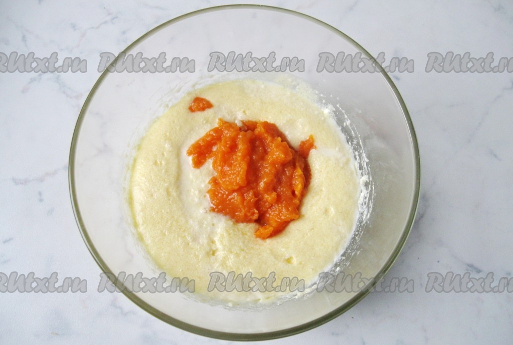 Тыквенное пюре нужно будет приготовить заранее, для этого очищенную тыкву нужно нарезать на кусочки, выложить на тарелку, на которой можно готовить в микроволновке. Поставить тарелку с тыквой в микроволновую печь. Запекать при максимальной мощности 5 минут (до мягкости тыквы). Можно запекать тыкву до мягкости (в течение 45-50 минут) и в духовке, разогретой до 180 градусов. Мягкие кусочки тыквы пробить погружным блендером до получения однородного пюре. Для приготовления кекса нам потребуется примерно 150 грамм тыквенного пюре. Добавить тыквенное пюре в молочно-масляную смесь, перемешать миксером до однородности.