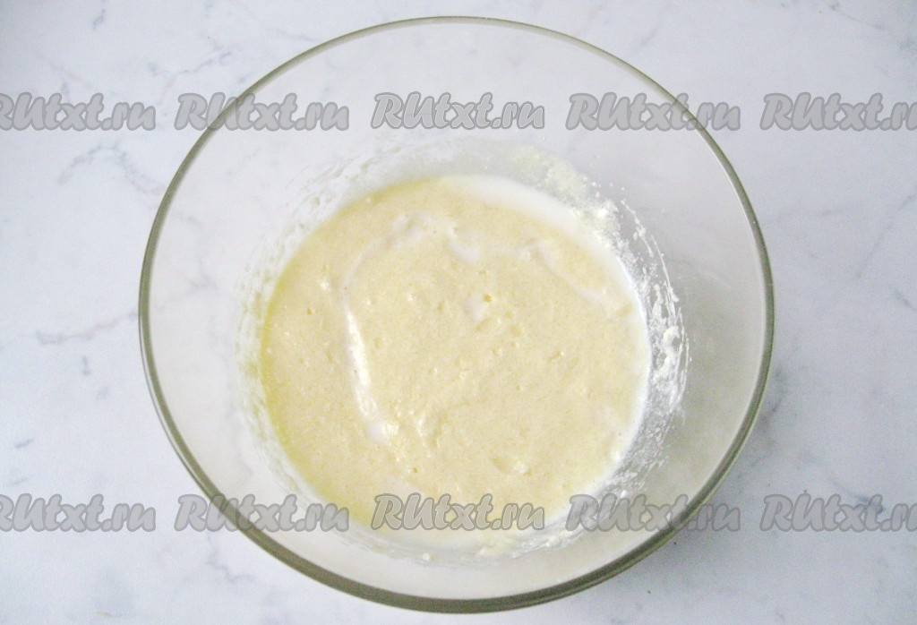 Влить молоко и перемешать молочно-масляную смесь миксером.
