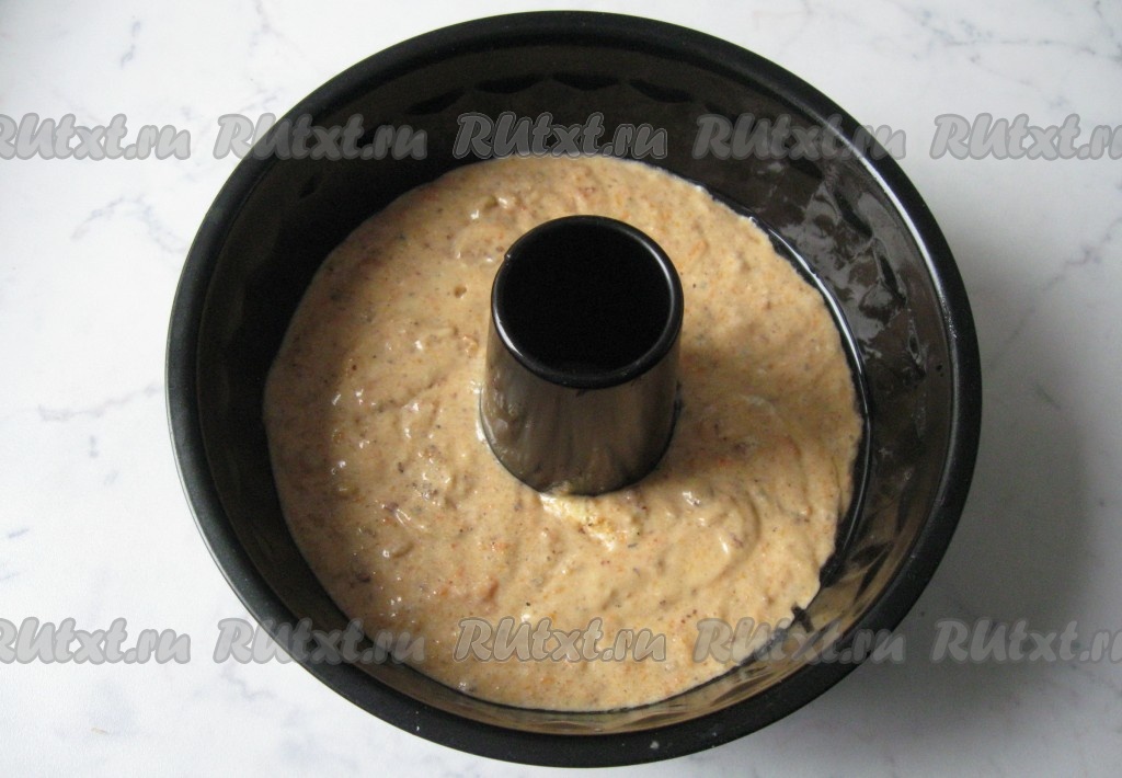 Форму для кекса смазать маслом и вылить в неё тесто.