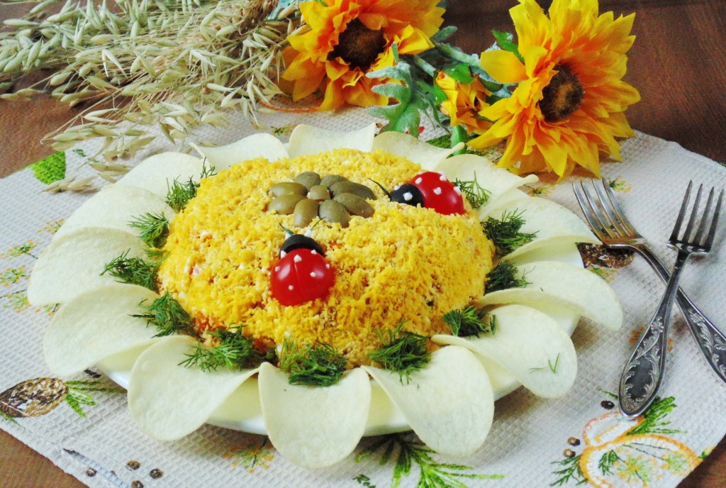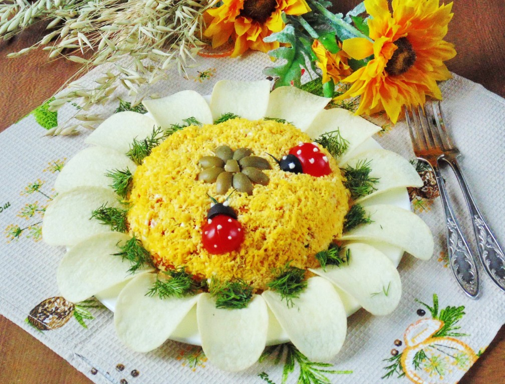 Украсить салат "Подсолнух". Картофельные чипсы выложить по кругу. Оливки разрезать на четыре части и выложить в середине цветка. Помидоры черри разрезать пополам. Из маслины сделать носик жучка и покрыть его капельками майонеза. Из укропа сделать усики. В каждый лепесток у основания подсолнуха насыпать измельченный укроп. На фото видно, каким ярким и очень красивым получился салат, приготовленный по этому рецепту.