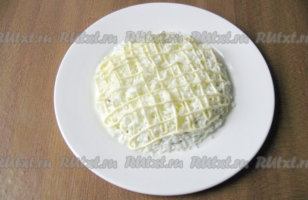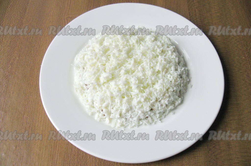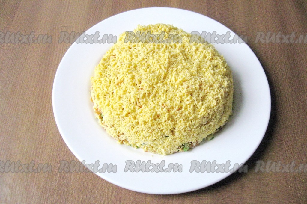 Желтки помять вилкой или натереть на терке. Покрыть весь салат измельченными желтками.