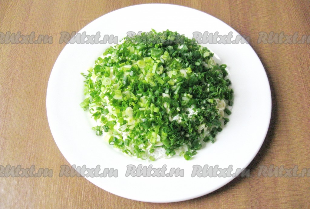 Зеленый лук помыть и мелко нарезать. Выложить следующим слоем салата.