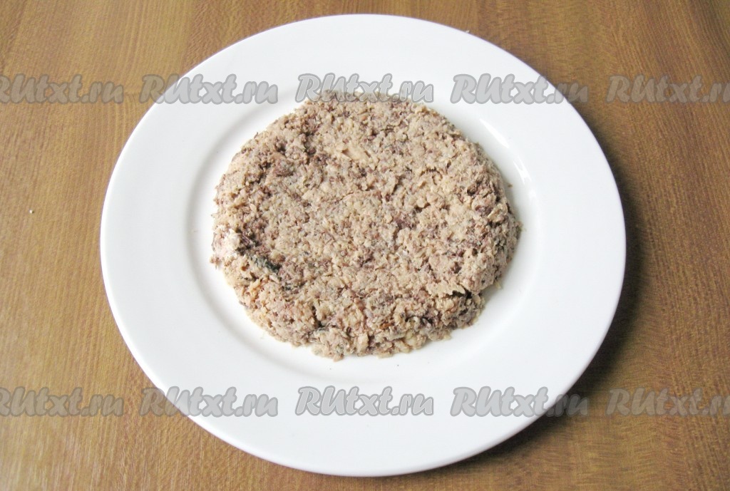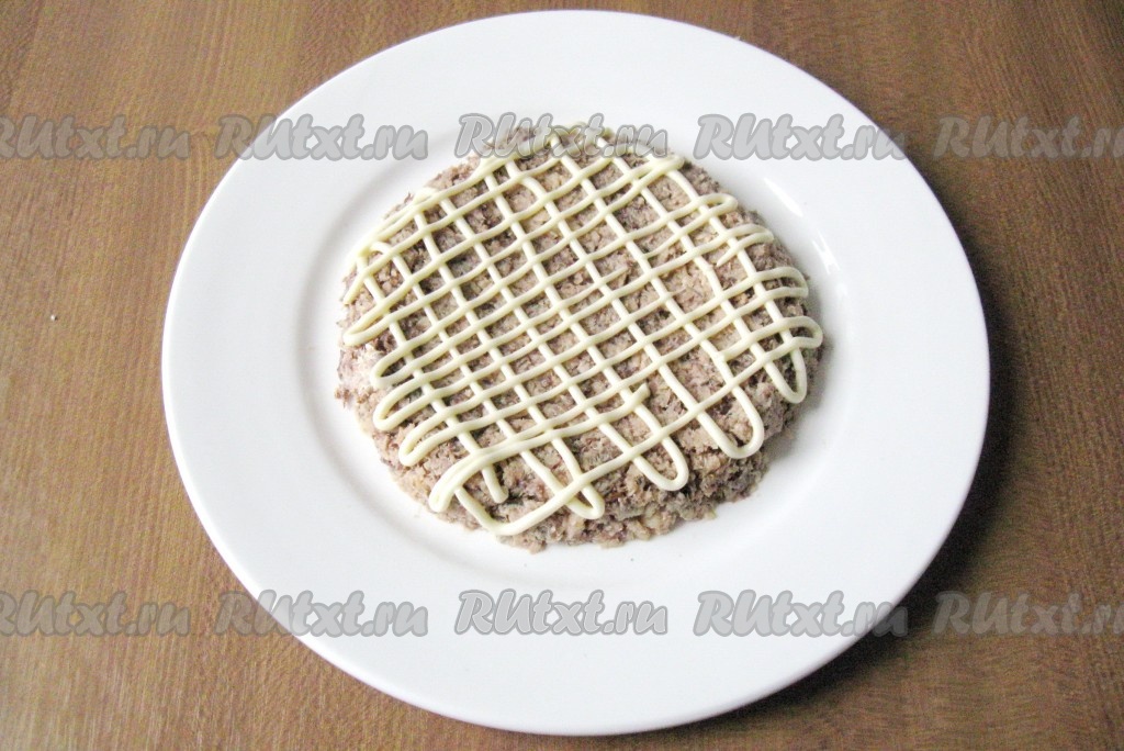 Консервы достать из банки и размять вилкой, предварительно слив жидкость. Выложить на большую тарелку первым слоем салата.
