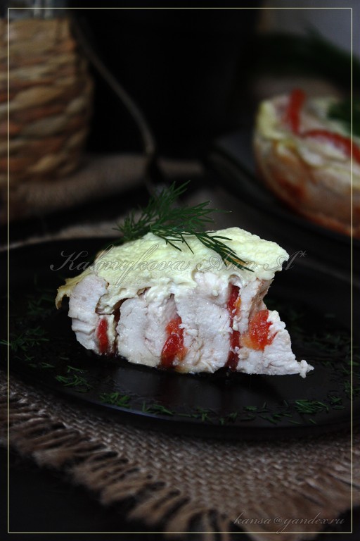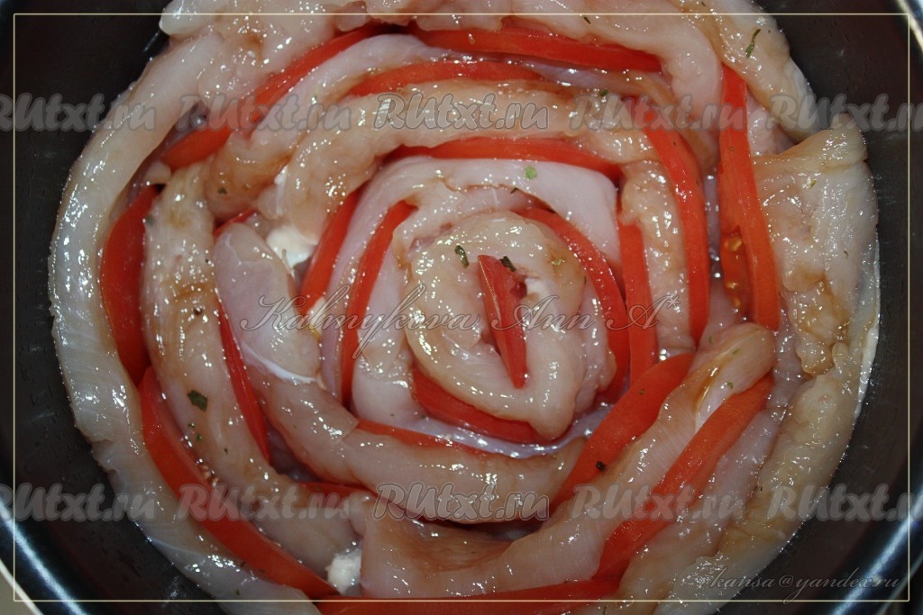 Куриное филе и помидоры по спирали, чередуя, выложить в форму.