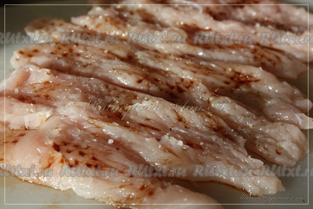 Куриное филе нарезать на длинные брусочки, отбить (получаются полоски длиной 2-3 см), посыпать специями и полить соевым соусом.