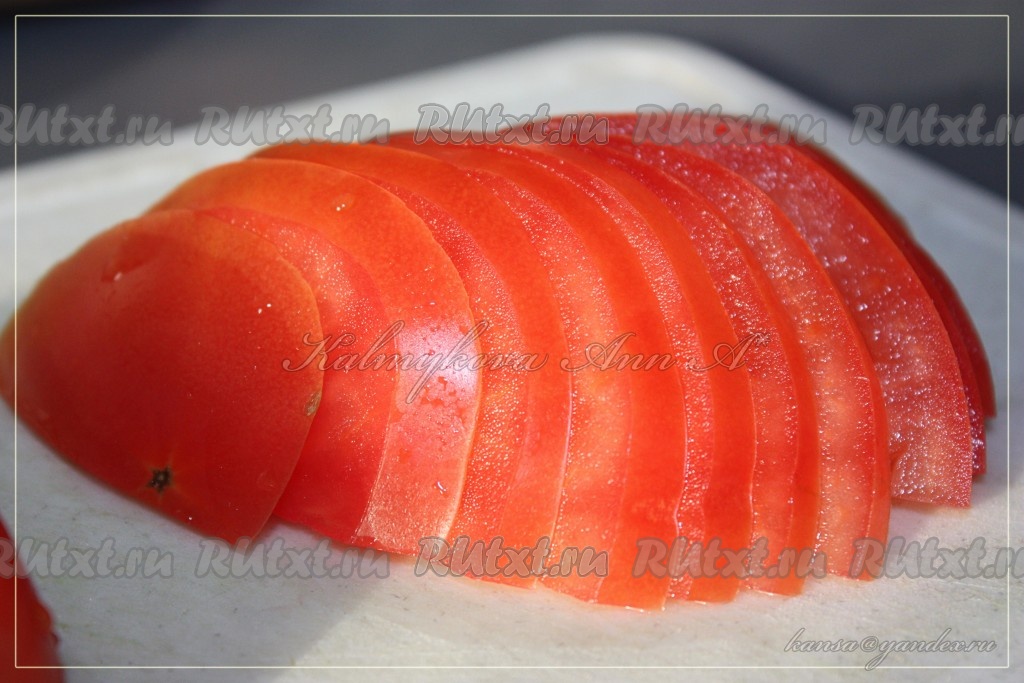 Помидор нарезать тонкими полукругами.