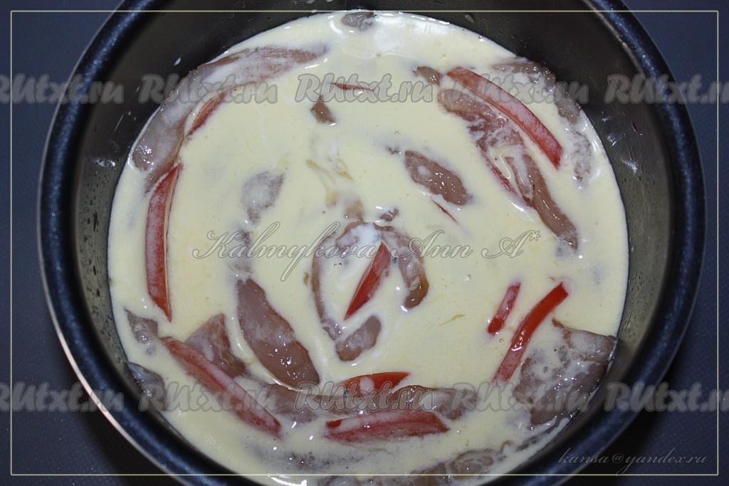 Залить пирог из куриного филе полученной смесью. Отправить в мультиварку на режим "Выпечка" на 30 минут или в разогретую духовку при температуре 180 градусов на 30-40 минут.