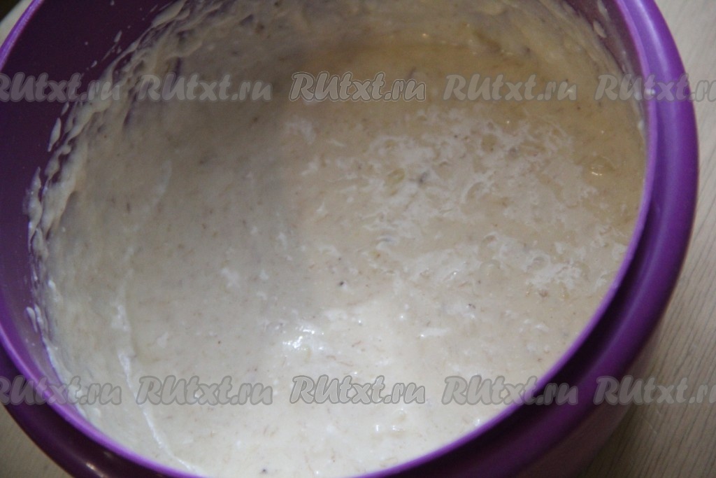 Дальше смотрим, если тесто слишком крутое, можно добавить немного молока. Здесь всё зависит от сочности бананов, от жирности и консистенции творога и конечно от объёма яйца. У меня для приготовления теста ушло 100 мл молока. Тесто для творожно-банановых оладий должно получиться по консистенции ровным, однородным и как густая сметана.