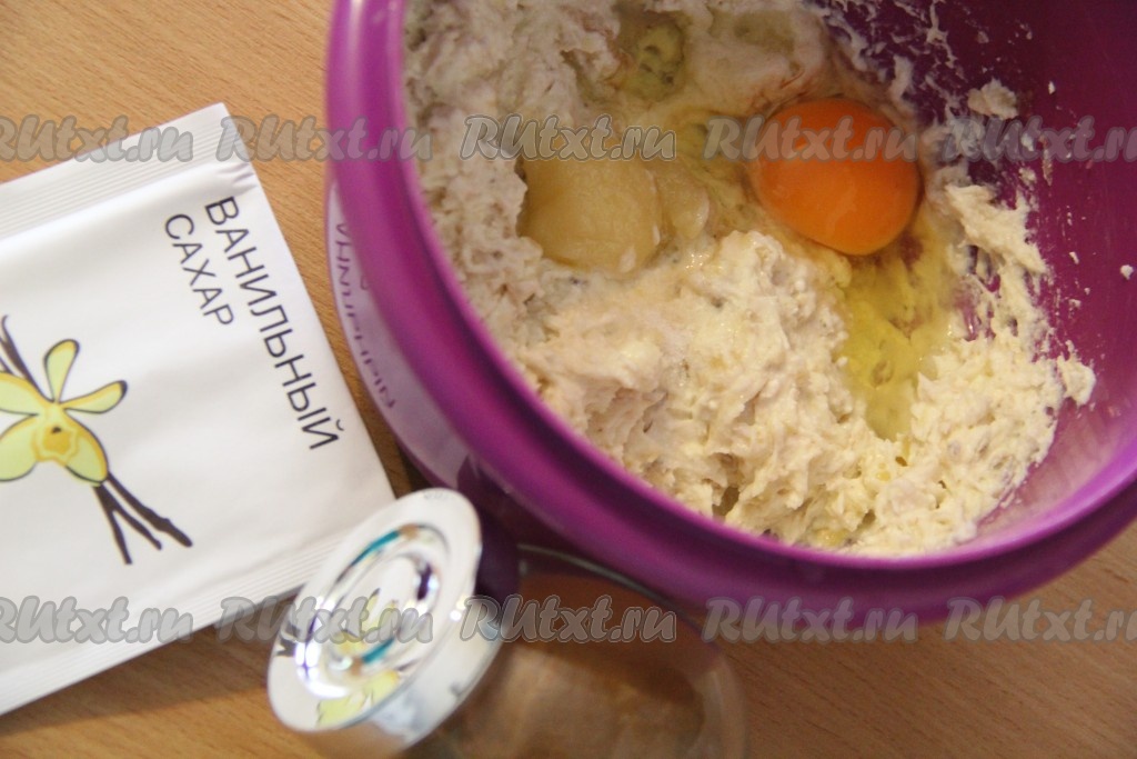 С помощью погружного блендера перемешать творог с бананами в однородную массу. Затем добавить яйцо и мёд. Ещё раз перемешать. Затем добавить ванильный сахар, корицу и соль. Всё тщательно перемешать.