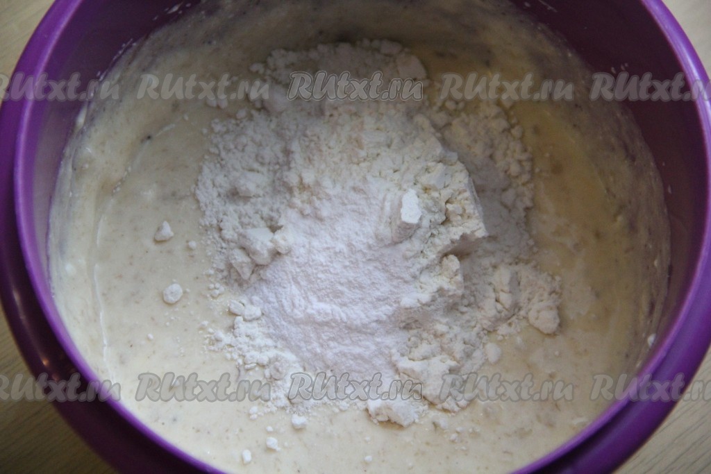 Затем всыпать муку и разрыхлитель. Всё перемешать ложкой.