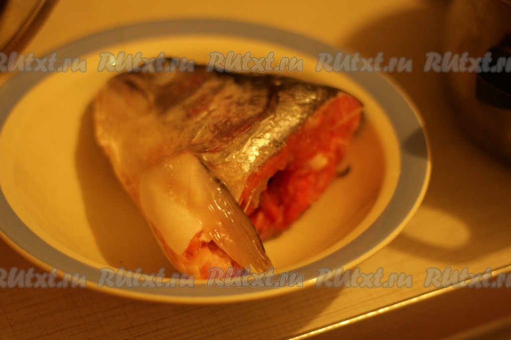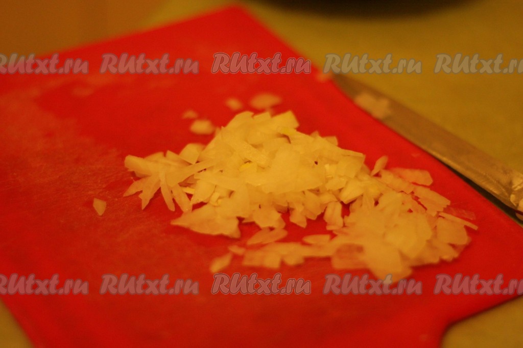 Залить голову 1,5 литрами воды и варить в течение часа. Готовый бульон процедить. Лук нарезать небольшими кусочками.