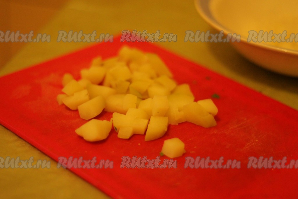 В бульон налить молоко, довести до кипения и добавить лук. Варить 10 минут. Картофель необходимо отварить в мундире (для того, чтобы в нем сохранилось больше полезных веществ). Очистить и нарезать небольшими кубиками.