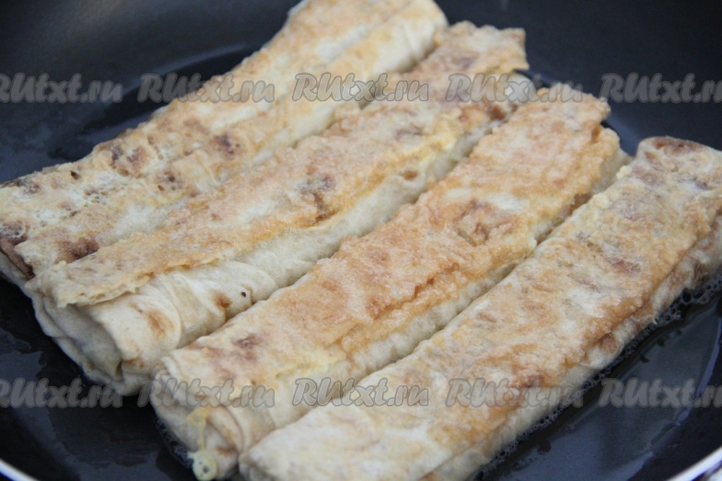 Сковороду смазать растительным маслом и хорошо разогреть. Выложить рулетики из лаваша с сыром в сковороду.