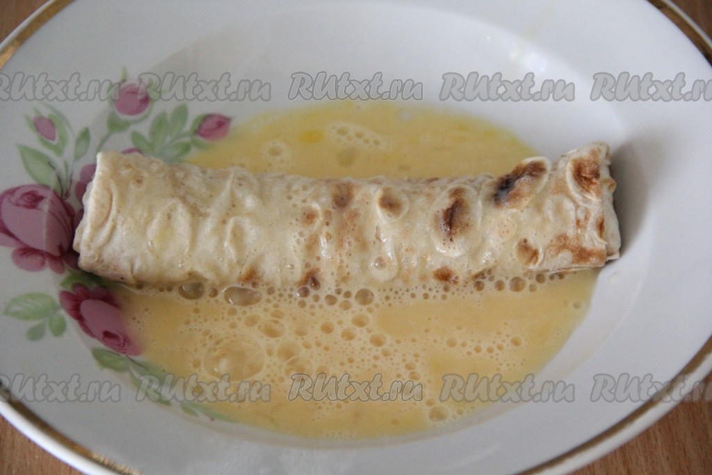 Обмакнуть рулетик в яичную смесь со всех сторон.