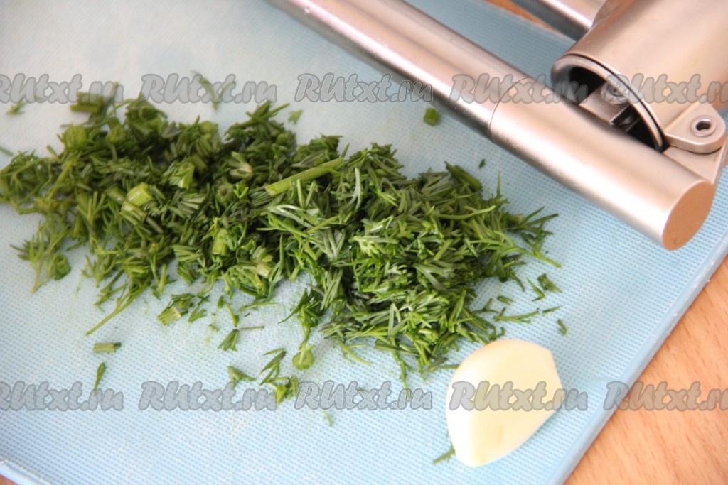 Зелень можно взять любую (например, петрушку, укроп и даже зелёный лук). В этот раз я взяла укроп. Вымыть укроп, обсушить, затем мелко нарезать. Чеснок почистить и пропустить через пресс.