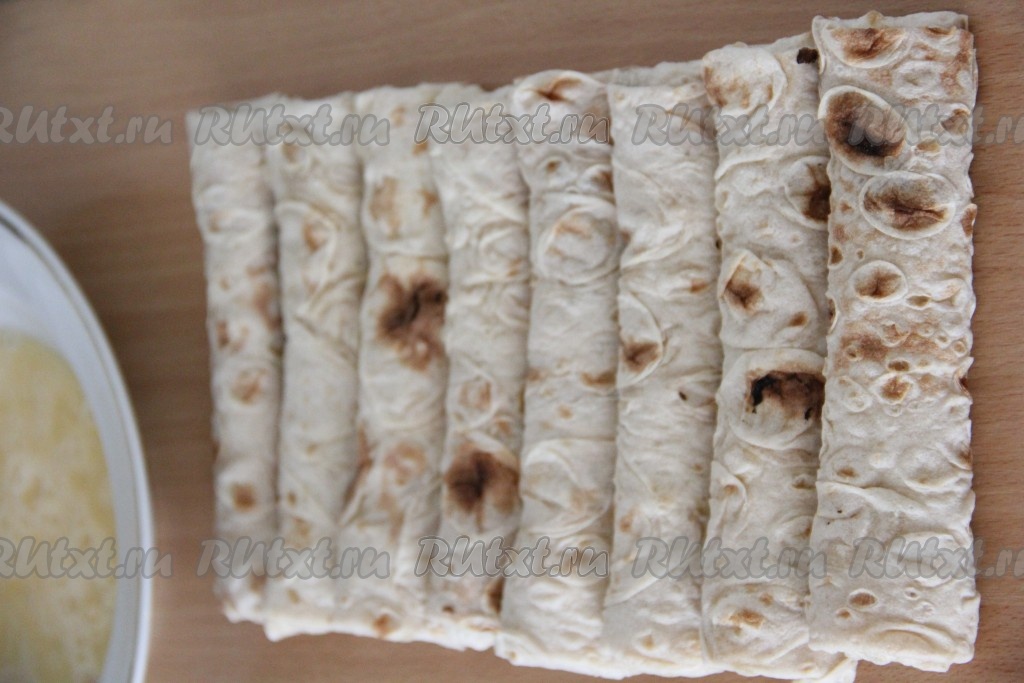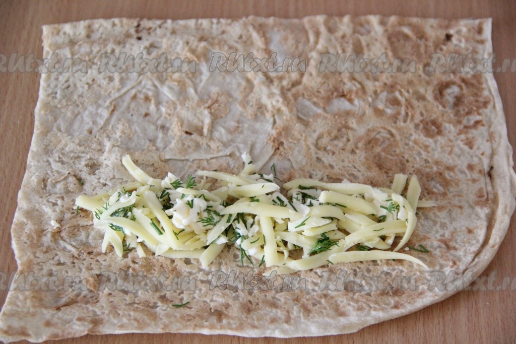 На лаваш ближе к одному из краёв квадрата выложить часть сырной начинки, как на фото.