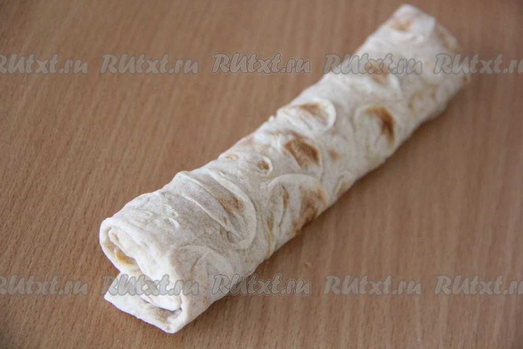 Подвернуть боковые края лаваша на начинку, а затем свернуть лаваш в плотный рулетик, начиная со стороны с начинкой.