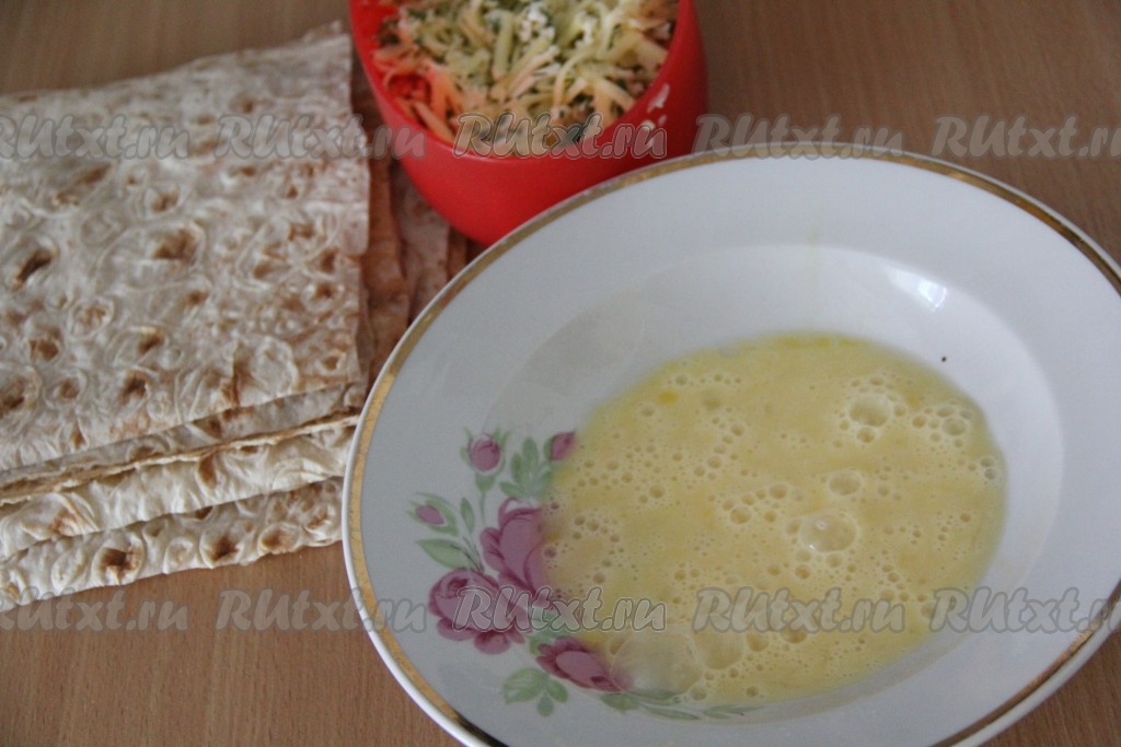 Яйцо слегка взбить вилкой. Лаваш нарезать на квадратики. Величину рулетиков определяйте сами, я приготовила рулетики маленького размера, можно сказать, "на зубок".