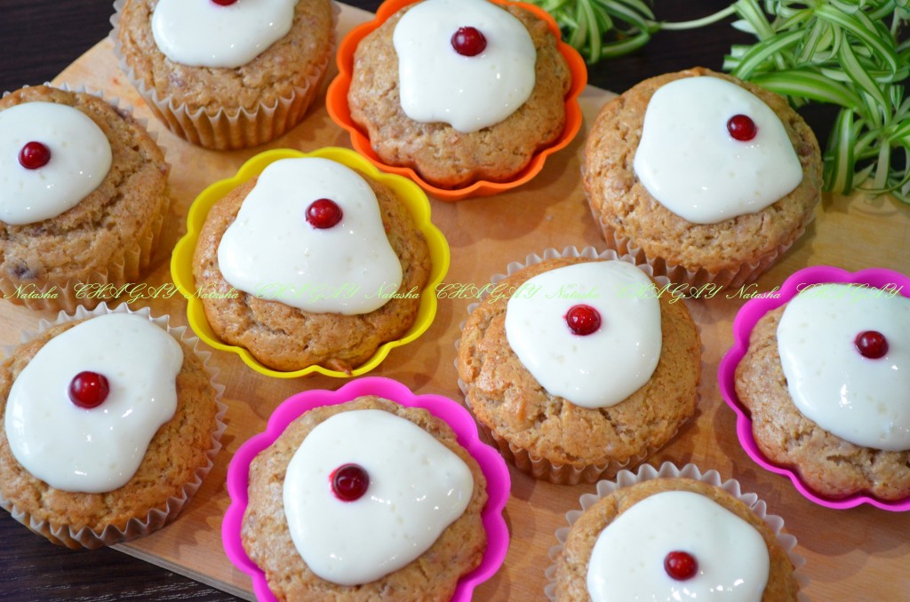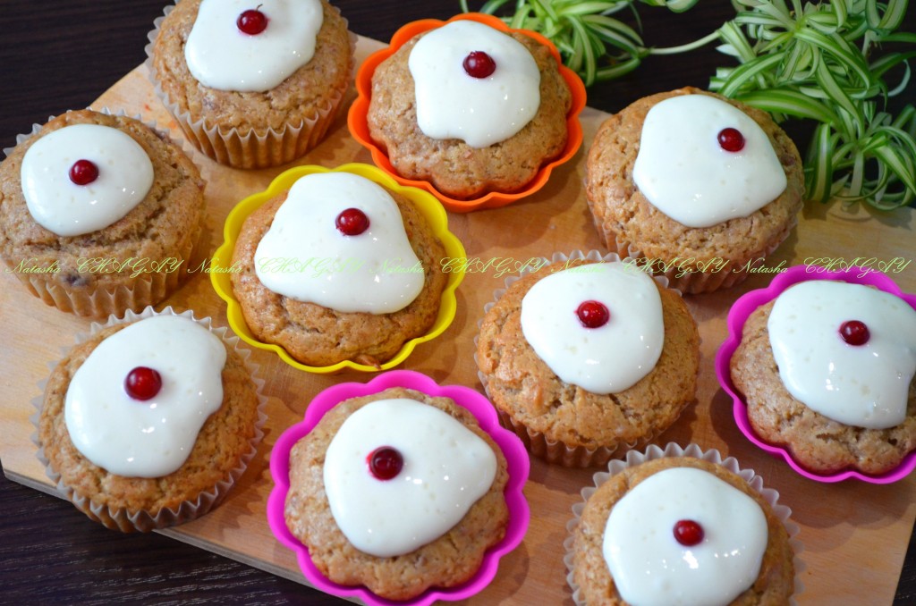 Выложить тесто в формочки (бумажные или силиконовые), почти доверху, и отправить на 25-30 минут в заранее разогретую до 180 градусов духовку. Готовность можно проверить зубочисткой. Время может отличаться.