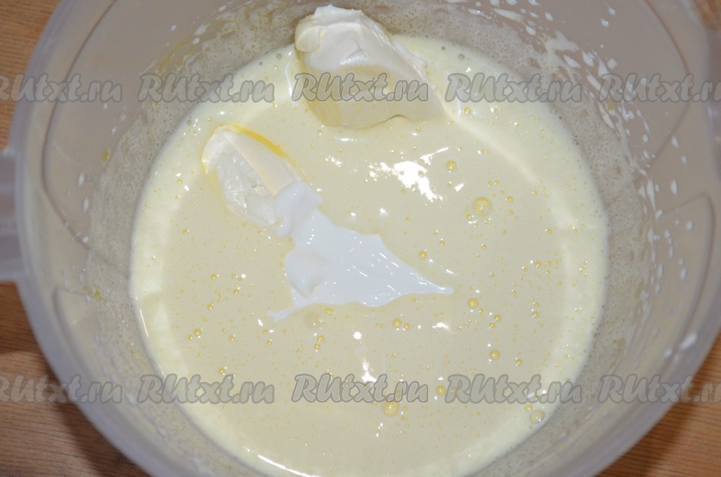 Яйца с сахаром и солью взбить в пышную массу. Размягченное сливочное масло и сметану добавить в полученную массу, взбить.