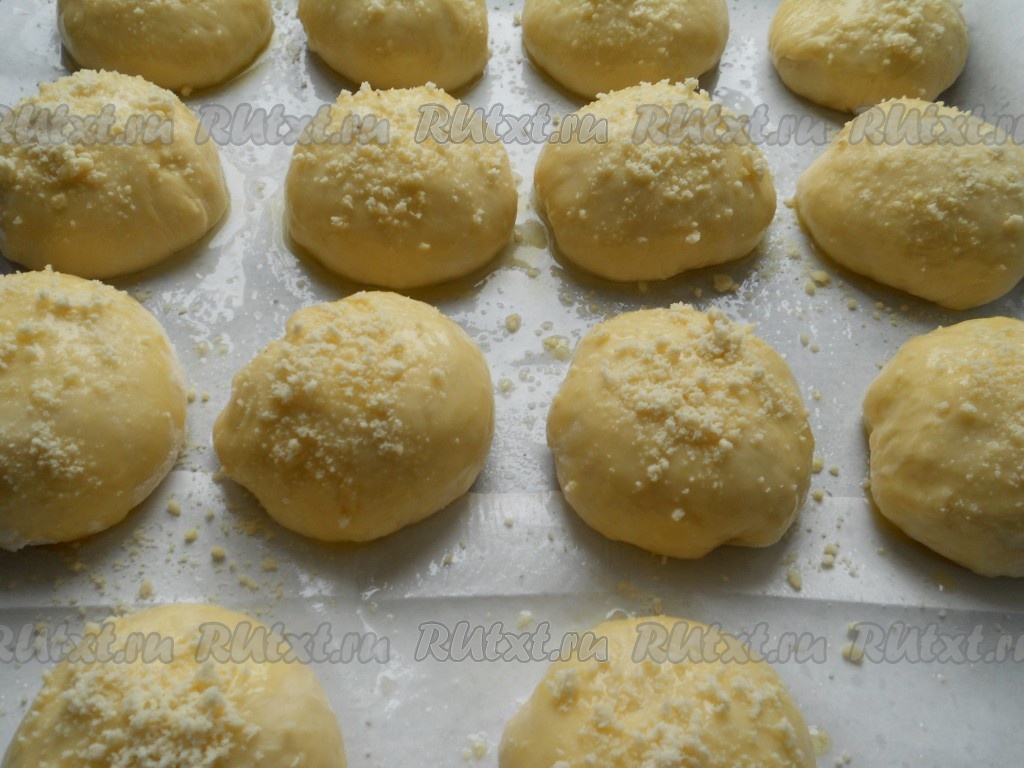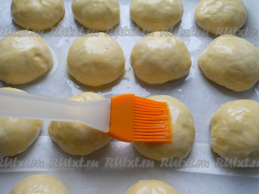 Противень застелить пергаментом и смазать растительным маслом. Сформировать из теста круглые булочки и выложить их на пергамент. У меня получилось 14 булочек. Для смазывания булочек растопить мед и смешать со сливочным маслом, перемешать до получения однородной смеси. Этой смесью смазать все булочки.