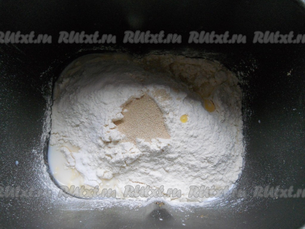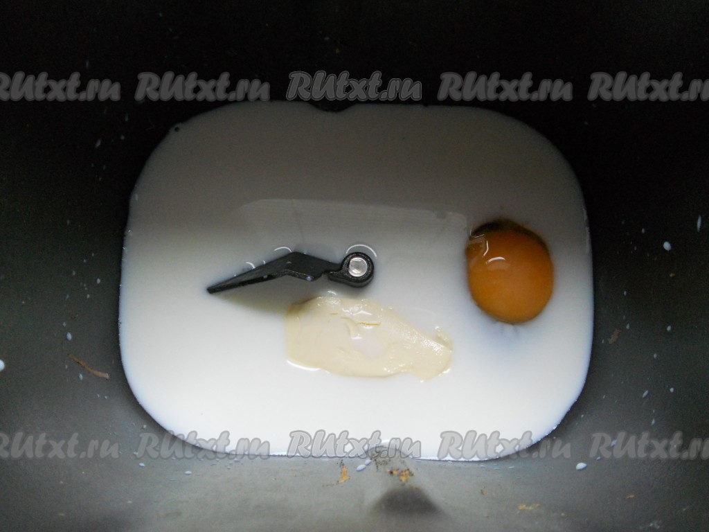В ведерко хлебопечки влить теплое молоко, добавить размягченное сливочное масло и яйцо, слегка перемешать.