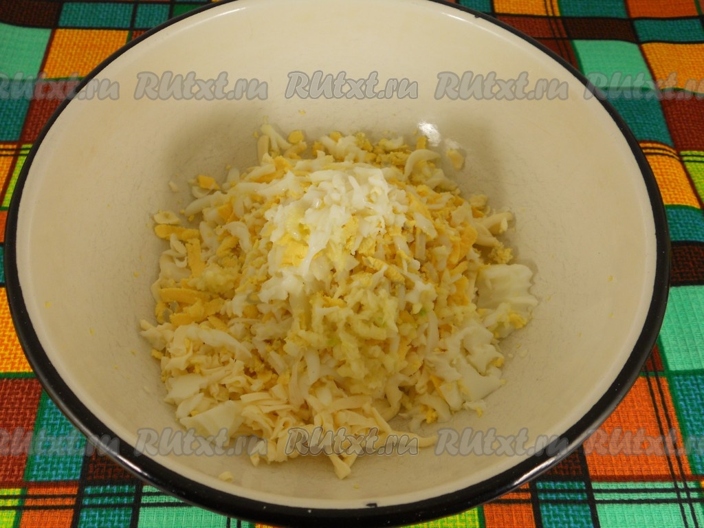 Яйца сварить вкрутую, остудить, очистить, натереть на крупной тёрке и добавить к плавленному сырку.