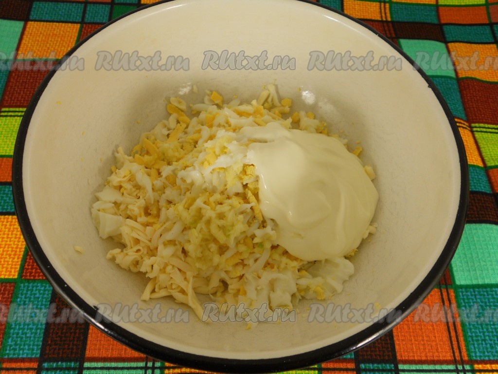 К полученной яично-сырной массе добавить пропущенный через пресс чеснок, соль и майонез.