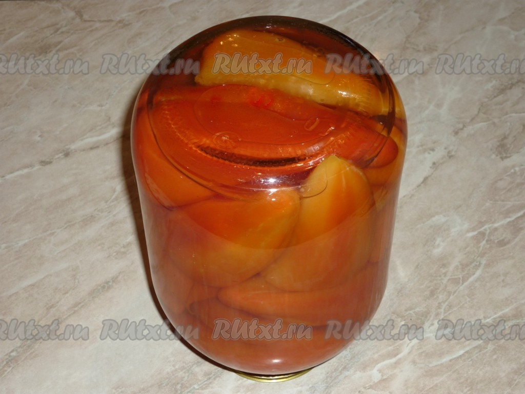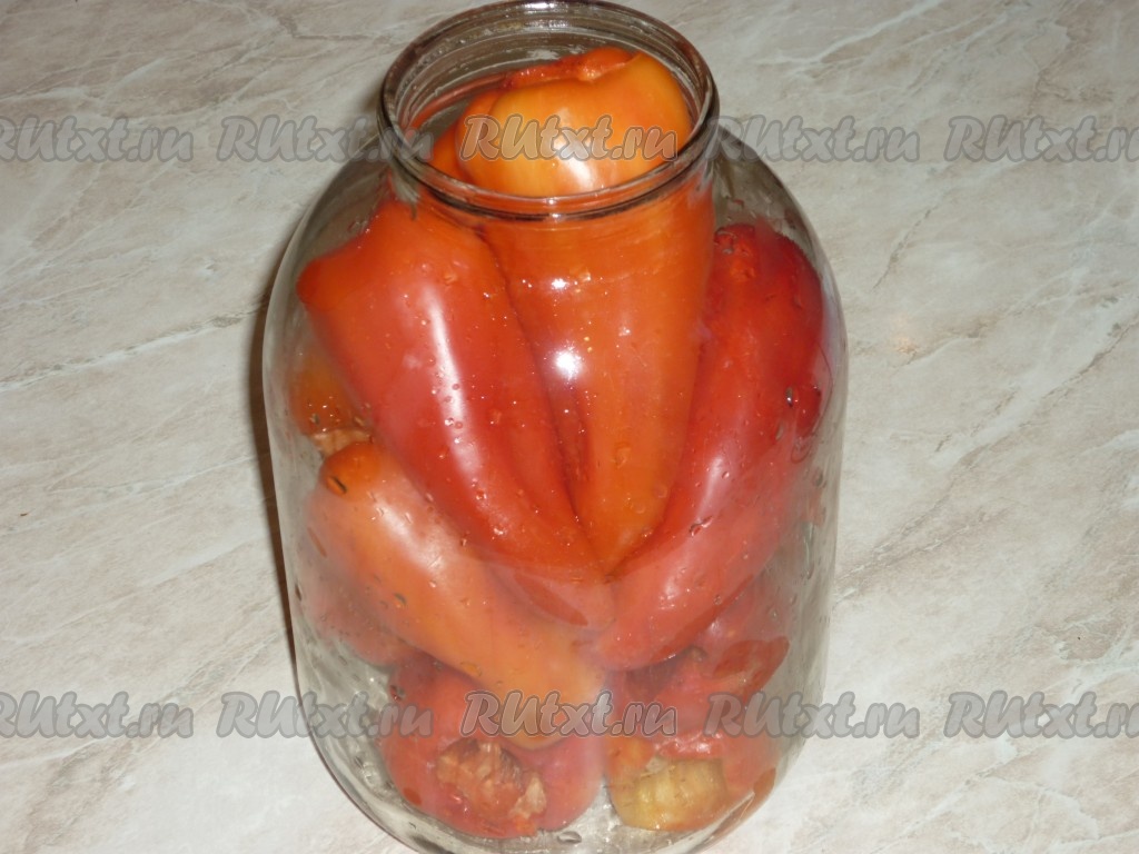 Уложить подготовленные болгарские перцы в простерилизованную трехлитровую банку.