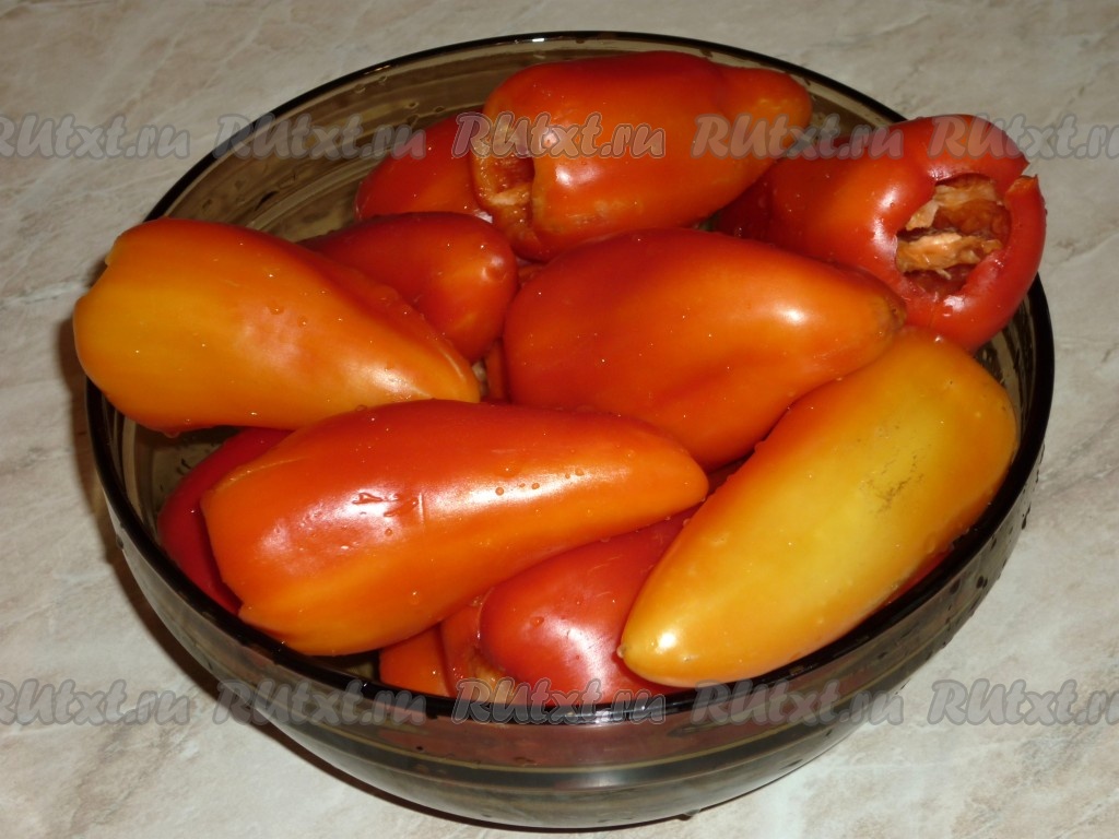Удалить плодоножку и очистить внутри от семян и перегородок, не повреждая целостности перчиков.
