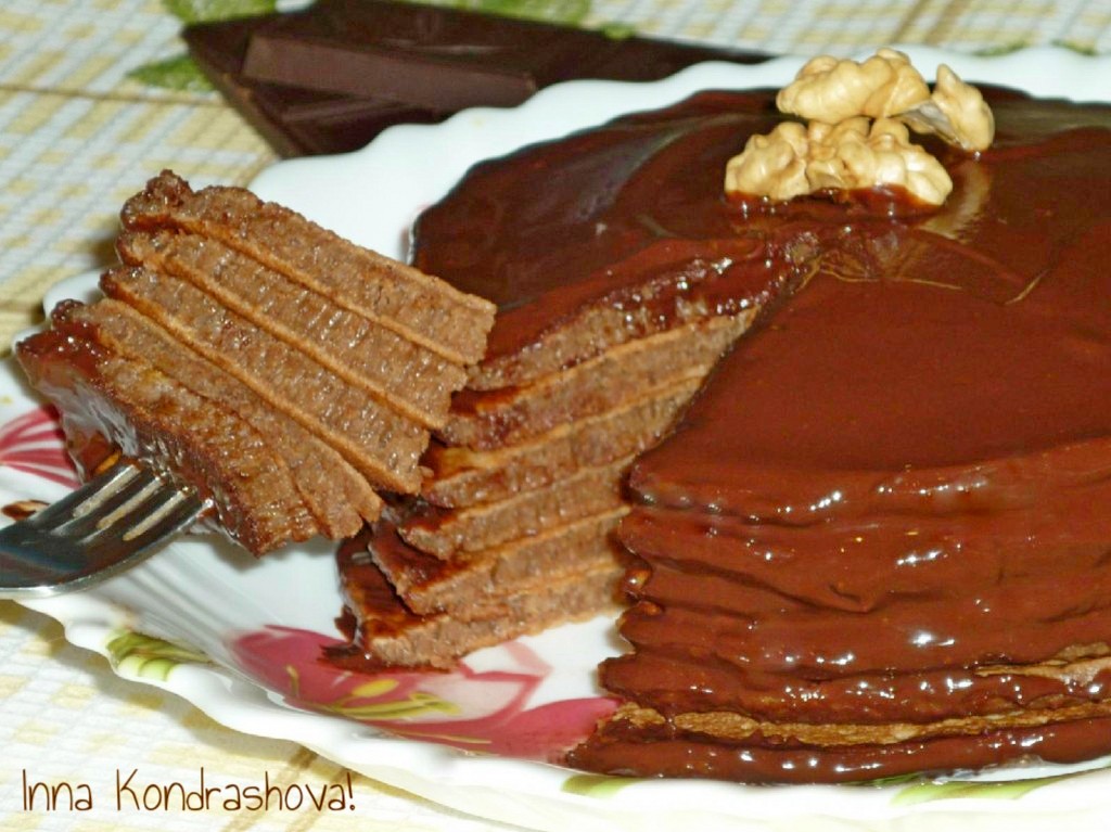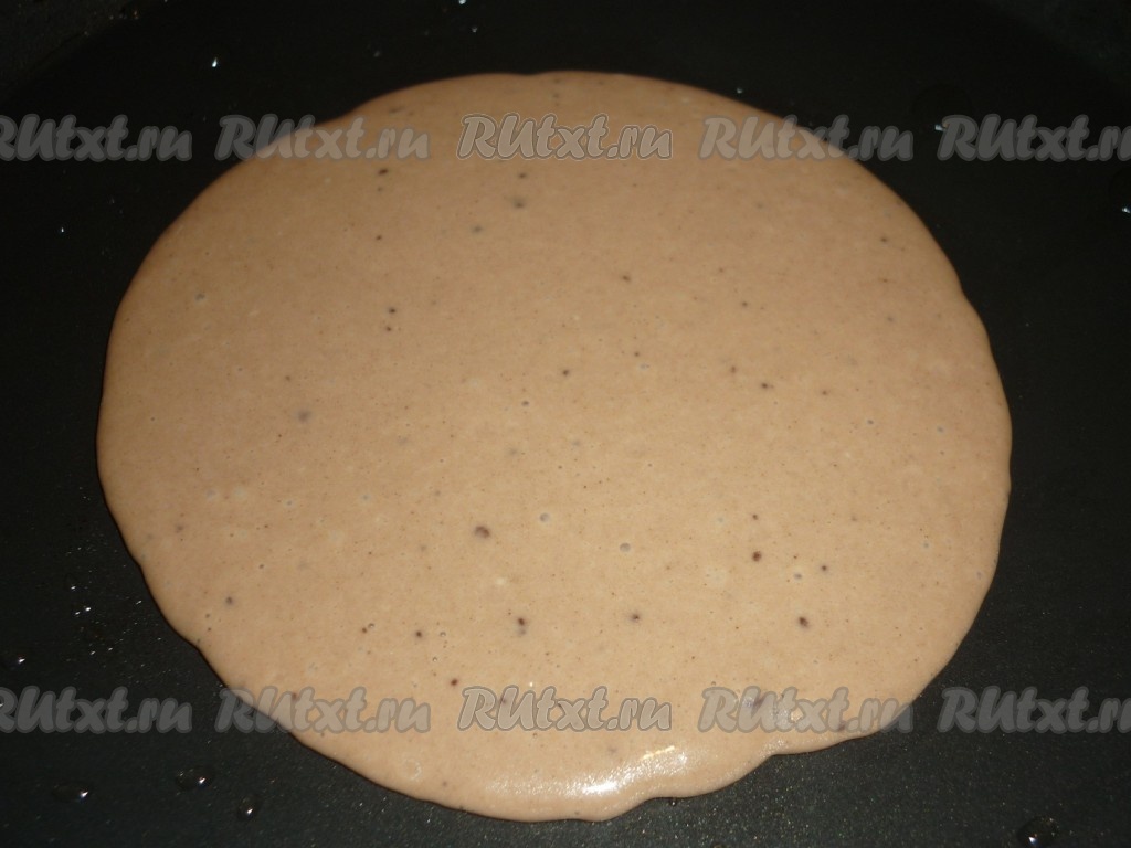 Аппетитные шоколадные оладьи, приготовленные из теста, замешанного на молоке, можно нарезать, как тортик, и угощать близких.