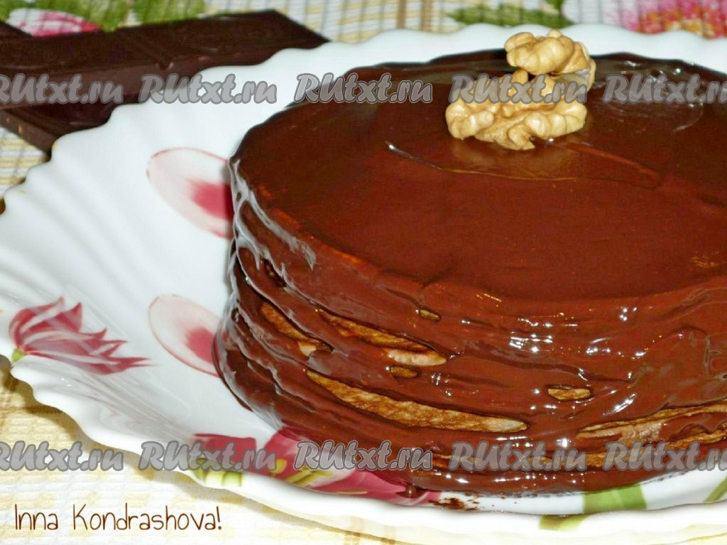 Я решила подать оладьи с шоколадной глазурью. Для приготовления глазури нужно соединить сливочное масло и шоколад, растопить, помешивая, на водяной бане. Пока шоколадная глазурь жидкая и горячая, поливаем оладьи и украшаем орехами.