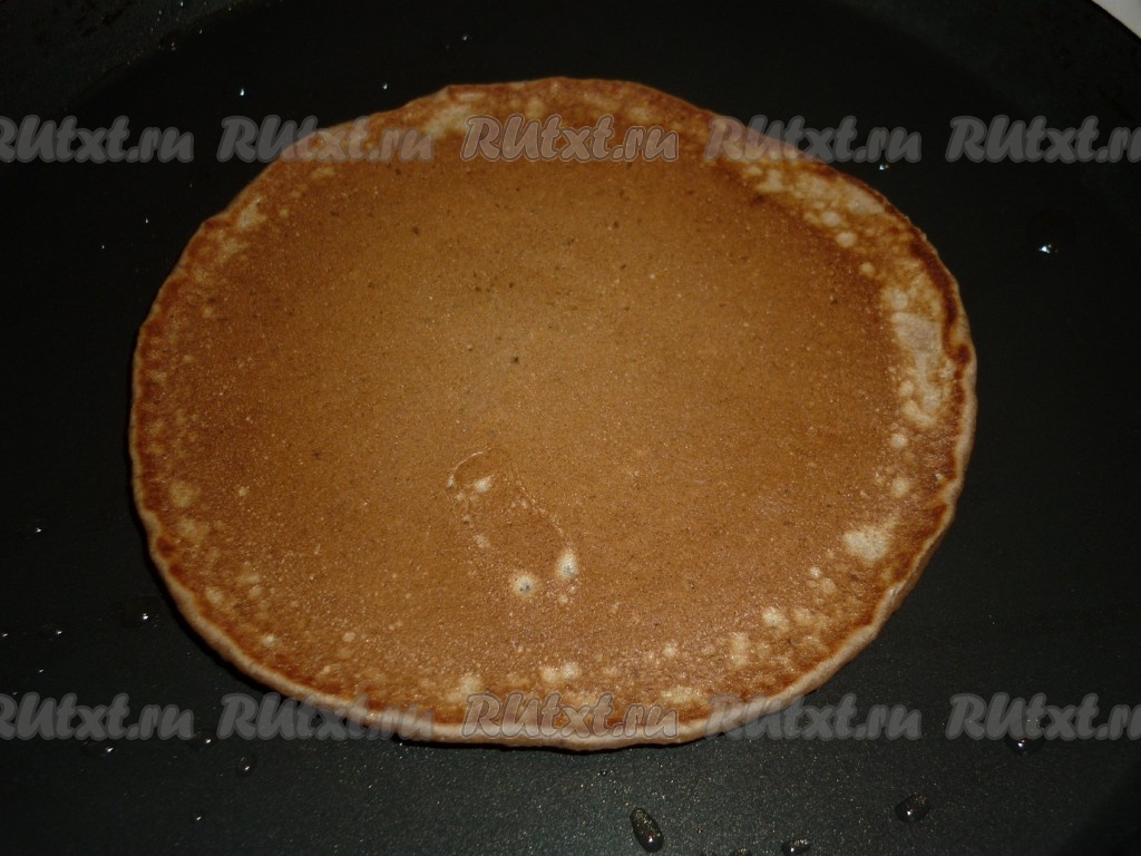 Налить тесто, распределить по сковороде и жарить на среднем огне примерно 1-2 минуты (до румяности снизу). Как только по всей поверхности оладушка появятся пузырики, можно переворачивать.