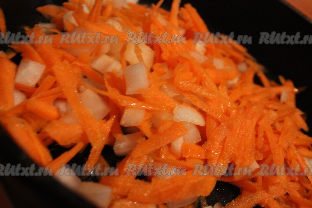В сковороде разогреть немного растительного или оливкового масла. Выложить нарезанный лук и обжарить, помешивая, на среднем огне в течение пяти минут. Затем в сковороду к луку добавить натертую морковь, хорошо перемешать и обжаривать овощи до легкой румяности, иногда помешивая, в течение 3-4 минут.