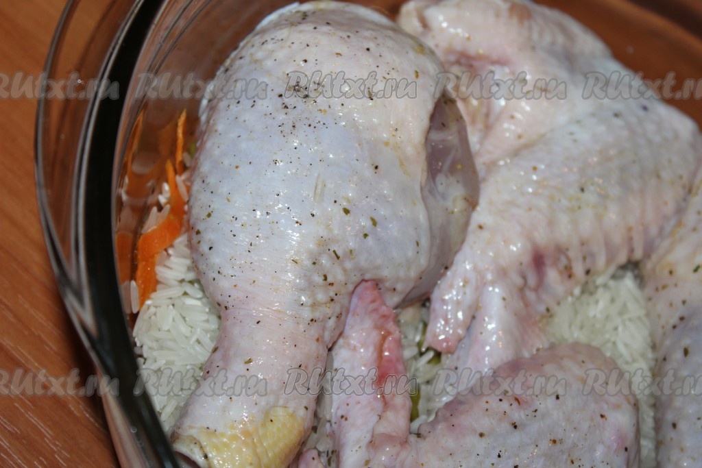 Поверх риса выложить курицу, добавить два стакана куриного бульона или воды.