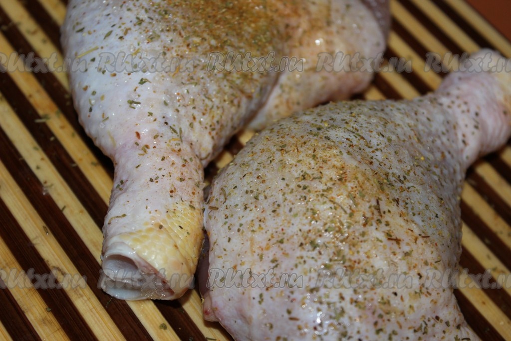 Куриные окорочка (при желании можно использовать любые другие части курицы) хорошо вымыть, обсушить, посыпать солью, перцем и любимыми специями.