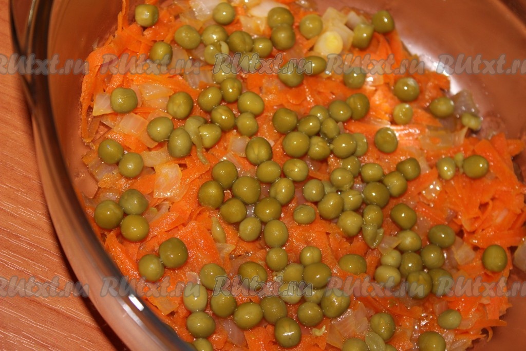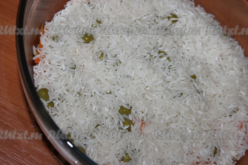 Рис тщательно промыть под проточной водой, добавить к луку, моркови и горошку. Посолить, поперчить.
