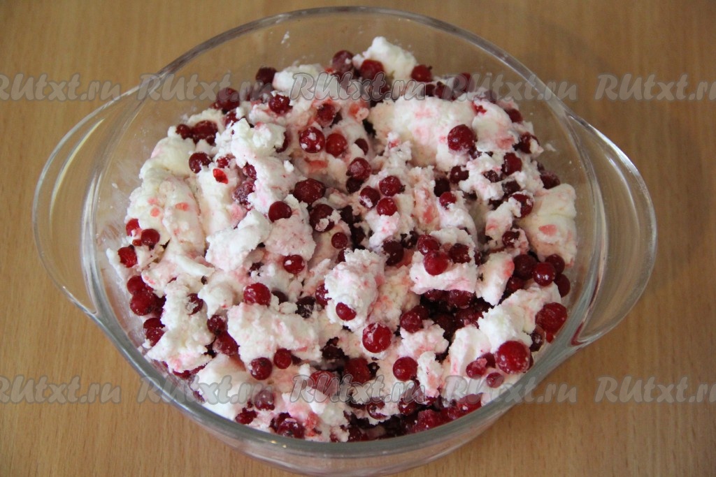 Соединить творог и ягоды. Хорошо перемешать. Если хотите начинку послаще, просто добавьте сахар.